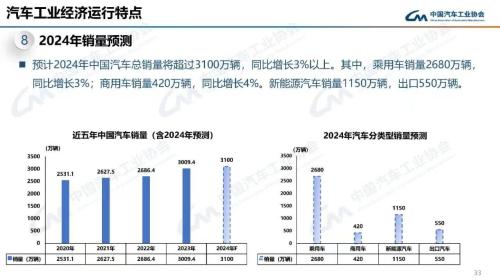 根据中汽协预测,2024年,预计中国汽车总销量将超过3100万辆,同比增长3%以上。其中,乘用车销量2680万辆,同比增长3%;商用车销量420万辆,同比增长4%。新能源汽车销量1150万辆,出口550万辆,继续保持高增长态势。