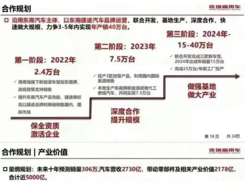 而根据合作规划资料,奇瑞对东南汽车收购的第一步就是以“贴牌车”的形式在2022年实现2.4万辆销量目标,帮助东南汽车保全生产资质。之后,双方再逐步投放新车型、扩充产能,争取在5年内实现年销40万辆的目标,并完成25万辆年产能的新工厂建设。