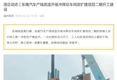 随后2月,福州国资官微又发布了东南汽车产线改造升级冲焊总车间改扩建项目二期开工建设的公告。根据公告内容,在闽侯县青口镇,东南汽车产线改造升级冲焊总车间改扩建项目二期的参建人员已投入新一年的生产建设中。