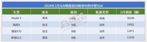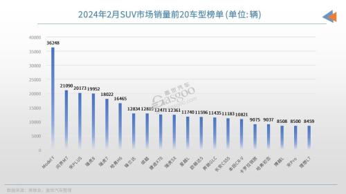 2月的国内SUV市场上,销量破3万的车型只有一款,特斯拉Model Y交出了超3.6万辆的月销量。问界M7的“黑马”姿态也很稳定,继1月之后,再次交出超2万辆的月销量,继续领跑国内增程混动市场。此外值得一提的是,自主产品占据国内SUV市场强份额的势头依旧凸显,2月的SUV销量前20榜单中,有15款车型都是自主车。