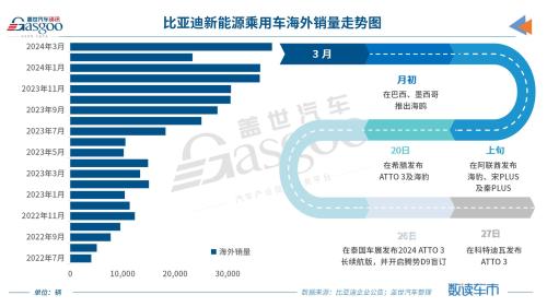 在此背景下,3月份比亚迪海外新能源乘用车销量累计完成38,434辆,创历史新高。而自2022年7月比亚迪公布数据至今,其海外新能源乘用车销量已突破39万辆,其中2024年前三个月累计销量就已突破逼近10万辆。