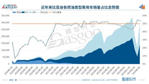而此前受极端气候频发,进入2024年后销量便大幅走低的纯电动乘用车销量依然并未在3月随气温回暖而破冰。单就比亚迪来看,其1、2月DM车型比重逐渐走高,在2月攀升至54.9%历史峰值后,3月份依然保持着53.62%的高占比。