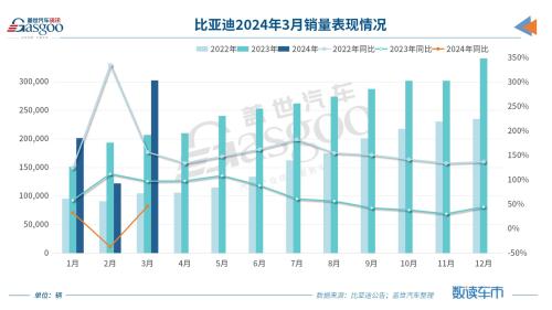 同理,若按照比亚迪3月新能源汽车30.24万辆月销成绩为基础推算,则将实现334万辆年销成绩,与盖世汽车研究院此前推测的340万辆相差无几。