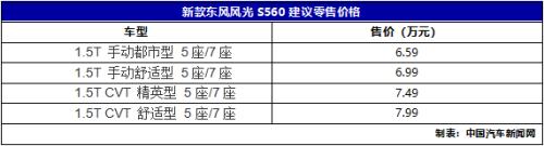 中国汽车新闻网讯日前,东风风光官方宣布将于5月30日起陆续推出新款风光S560。新车将推出4款车型,搭载1.5T+6MT/CVT两种动力组合,先期上市的1.5T手动都市型售价为6.59万元,1.5T CVT精英型售价为7.49万元,后续还将陆续推出两款1.5T车型——其中手动舒适型售价为6.99万元,CVT舒适型售价为7.99万元。