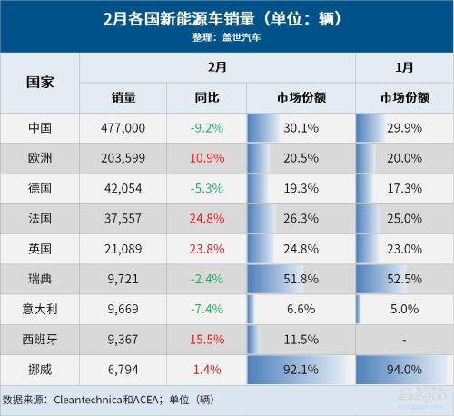 与此同时,欧洲电动汽车(包括纯电动汽车和插电式混合动力汽车)销量达到20.4万辆,同比增长10.9%,市场份额为20.5%。值得一提的是,由于德国和瑞典等市场的需求下降,纯电动汽车未能在欧洲市场抢占更多份额。