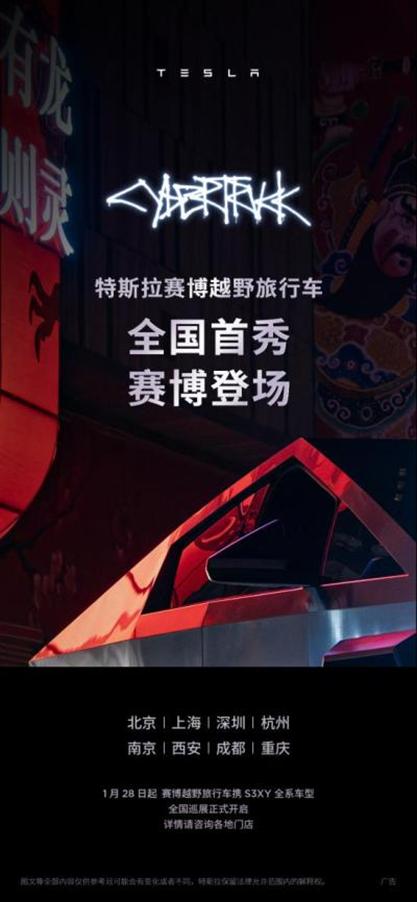 汽车信息网1月31日讯特斯拉作为全球话题度最高的新能源车企,其推出的每一款新车都吸引了无数全球用户的目光。近些时日,特斯拉旗下第五款车型Cybertruck定名赛博越野旅行车并且首度开启了它的中国之旅。据悉,特斯拉宣布将于1月28日召开Cybertruck全国巡展,届时,将在上海、北京、深圳、成都、南京、杭州、西安、重庆8座城市同时亮相。