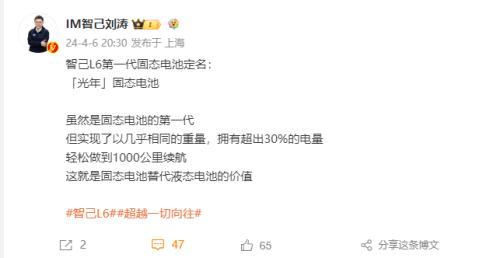 4月8日,智己汽车正式发布全新纯电车型智己L6,并宣称首发搭载“第一代光年固态电池”,这是行业首款量产上车的准900V超快充固态电池。