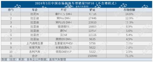 根据相关行业统计数据显示,3月插混车型销售21.2万辆,同比增长73%。根据各大车企公布的销量数据统计,自主品牌车型处于霸榜的状态。其中,比亚迪秦PLUS DM-i 3月销量销量31016辆,市场份额14.6%,位居第1,比亚迪宋Pro新能源、秦PLUS、驱逐舰05车型位列前茅。总体来看,中国品牌TOP10插混车型合计份额71.1%,集中度较高。