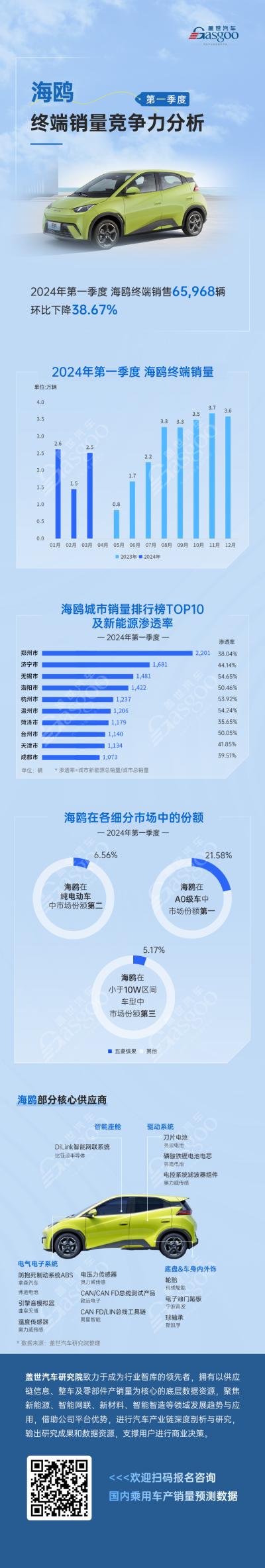 当前,新能源汽车市场竞争激烈,各类品牌、车型层出不穷,消费者的选择更加多样化,在诸多因素影响下,2024年一季度海鸥销量出现明显下滑。根据盖世产销量预测数据,2024年第一季度,海鸥终端销售65,968辆,环比大幅下降38.67%,其中销量最高的城市是郑州市,一季度累计销售2,201辆,城市新能源渗透率38.04%。其他城市新能源渗透率较高的还有温州市、无锡市、杭州市等。