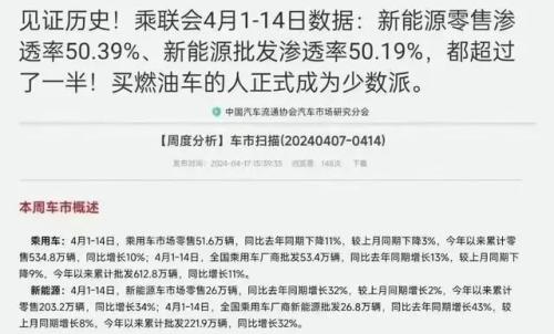 一周前,乘联会公布一组数据成为北京车展高层访谈的热议话题:4月1日至4月14日,中国乘用车市场零售51.6万辆,新能源车市场零售26万辆,新能源渗透率达到50.4%。