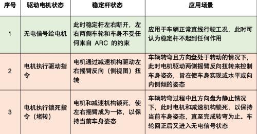 我们来看看ARC在车辆行驶时的基本作用原理。当车辆处于直线行驶时,无电源信号给到电机,ARC可以实现左右断开,左右轮可以独立跳动,此时单侧的路面冲击不会传导到另一侧,可避免衍生冲击,保障行驶舒适性。当车辆进行转向时分为方向盘转动(瞬态)和方向盘静止(稳态)两种情况,当方向盘转动时,基于方向盘转角、车速、侧向加速度、横摆角速度等信号,电机通过驱动稳定杆两端反向扭转来控制车身倾斜的姿态,从而使车身保持水平(甚至可以向内侧倾呈反离心)姿态;在方向盘静止但车辆还在转弯时,电机和减速机构将稳定杆锁死成为一体,目的是保持当前车身姿态,直至完成转弯为止。车轮回正后ARC又进入电机无电信号状态。下表是ARC典型行驶场景说明: