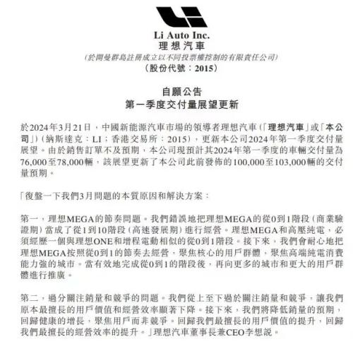 而理想L6的初步胜利,也让理想汽车得以重整旗鼓。在过去几个月,李想过得并不如意。最显而易见地便是理想汽车在3月21日发布公告宣布下调第一季度交付量预期,将此前发布的10万至10.3万辆的交付预期下调为7.6万辆至7.8万辆。