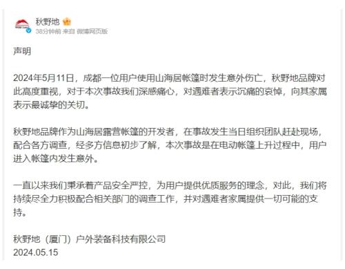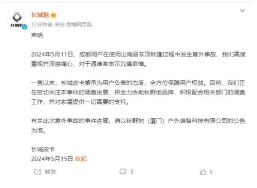 长城炮官微在声明中表示,对成都用户在使用山海居车顶帐篷过程中发生的意外事故深感痛心和惋惜,并向遇难者家属表达了沉痛的哀悼之情。公司表示将密切关注此事件的调查进展,全力协助秋野地品牌,积极配合相关部门的调查工作,并向家属提供一切必要的支持。同时,长城炮方面还强调,关于此次事故的进一步信息将以秋野地(厦门)户外装备科技有限公司的公告为准。