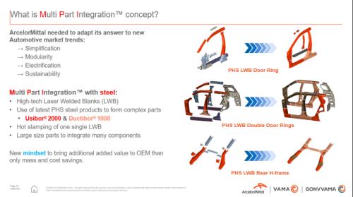 MPI车身一体化解决方案基于三个核心点:铝硅镀层热成形材料、热成形激光拼焊工艺及热冲压成型工艺。通过热成形材料避免复杂形状件成型难题,激光拼焊实现成型前连接,节省后续组装工序。我们在2016年首次引入热成形激光拼焊门环概念,并成功实施多个本土化项目。门环解决方案能实现多部件一体化冲压成型,降低重量,提升碰撞性能,节省模具投入。
