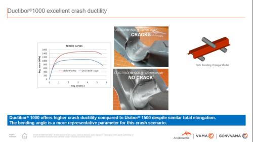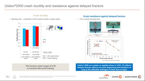 另一款值得介绍的产品是Ductibor®1000,这款新一代软区材料强度达到1000兆帕以上,韧性极佳。它可与Usibor®系列搭配使用,也可单片冲压使用。经过热冲压和烤漆后,其屈服强度可达800兆帕以上,抗拉强度可达1000兆帕以上,折弯角可达80度以上。VAMA在2018年完成工业化生产,并于2019年实现稳定批量供货。