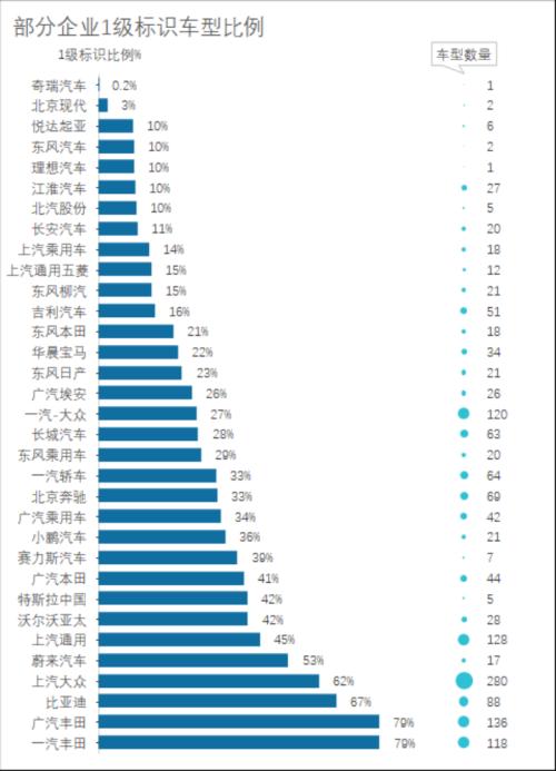 根据目前统计数据,CPP平台已公示车型中,部分企业1级标识车型情况如下图所示,广汽丰田和一汽丰田表现最佳,1级标识车型占比为79%,比亚迪紧随其后,占比达67%。