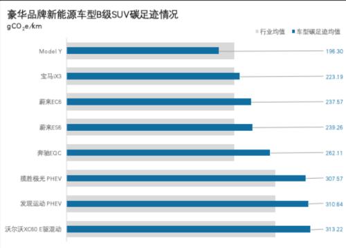 对比豪华品牌新能源车型碳足迹情况,高碳车型更多,在B级SUV分类下,纯电动车中,除Model Y碳足迹低于行业均值,其余四款车型均高于行业均值;插电式混合动力车中,三款车型碳足迹均高于行业均值。