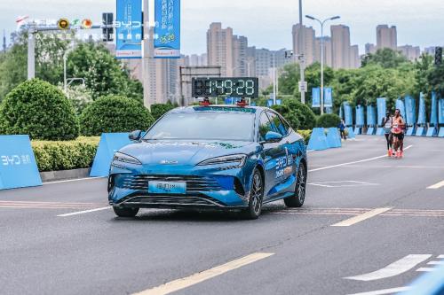 驱逐舰05、宋PLUS DM-i、海豹DM-i、护卫舰07四款车型,分别担当赛事的竞赛指挥车、外场裁判长车、全程/半程女子计时先导车等,在陪伴参赛者直抵终点的同时,也为工作人员带来了高效、环保、舒适的驾乘体验。