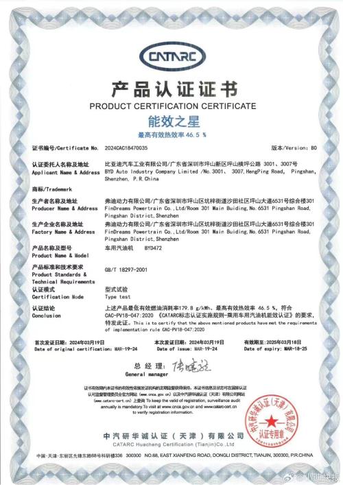 同一时间,在其公众平台上再次甩出一张“由中汽研盖章认证的最高有效热效率46.5 %”的证书,并强调“像这种没量产的,更高热效率的我们还有大把,不说而已。”将这场争论增添了更多的话题和悬念。
