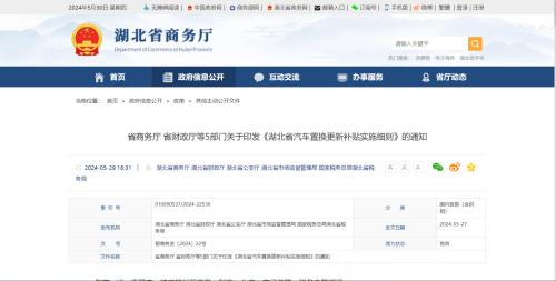 5月30日消息,湖北省商务厅、湖北省财政厅等5部门于近日发布了《湖北省汽车置换更新补贴实施细则》,宣布将安排3亿元财政资金用于发放汽车置换更新补贴。