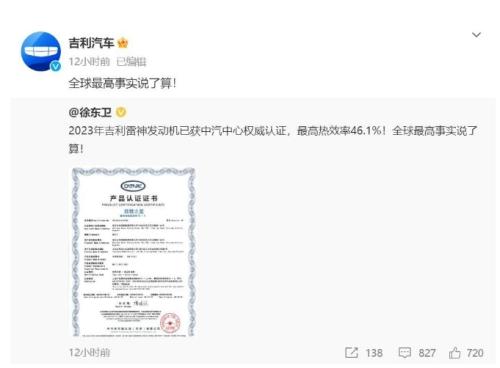 吉利方面强调,这微小的差距足以证明其在技术上的精益求精与不懈追求,并自豪地宣称自己才是全球热效率最高的发动机制造商。不仅成功把比亚迪的热度带了过来,也让广大吃瓜群众吊足了胃口,都想知道现在谁才是技术最牛的。