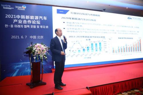 中国国际贸易促进委员会机械行业分会周卫东会长在会上发言表示:“近年来,中韩两国在新能源汽车领域都加大了研发投入,促使各自相关技术和产品的快速发展,新能源汽车也逐渐成为两国合作的重要领域。中韩两国在共同开展新能源汽车研发项目上已经有了良好的开端,希望依托‘一带一路’平台和《区域全面经济伙伴关系协定》签订的机遇,发挥我国产业政策完善、市场规模潜力大等优势,深化开放合作,构建国际协同、跨界协同合作平台。我们真诚希望,两国新能源汽车产业同仁广泛开展多层次、多形式的交流合作,凝聚共识,互学互鉴,增进友谊,携手共进、强强联合,在推动中韩两国汽车产业健康发展的同时,也从更深层次上推动全球汽车产业的变革。”