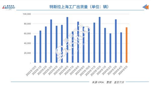 根据乘联会6月4日公布的初步数据,上个月,特斯拉上海工厂的出货量(包括内销和出口)同比下降6.6%,至72,573辆。不过数据显示,相较4月份更低的62,200辆,5月的出货量依然环比增长了17%。