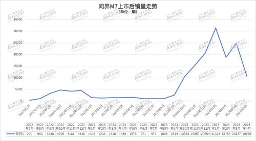 从实际上险量数据来看,问界新M7自去年10月起迅速突破万辆,今年1月突破3万辆大关。去年9月至今年4月,该车型累计销量达13.4万辆,基本消化了大定订单数据。