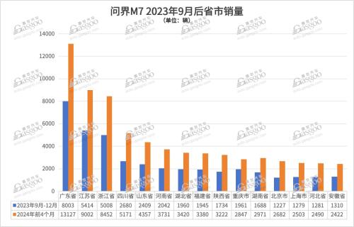 以问界新M7上市时间为分界线又会发现,自2023年9月后,该车型在多个城市销量出现大幅增长。但去年9月前,没有任何一个省市销量突破万辆大关。即使是广东、江苏和浙江,三大省份也是在2000-4000辆区间。直至9月问界新M7推出后,才出现销量暴增。