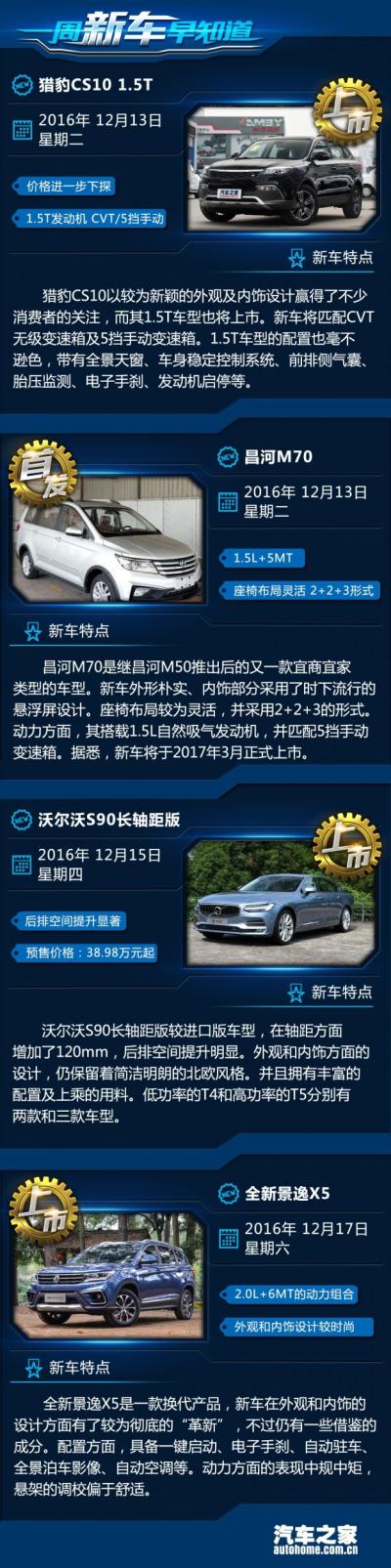 马上进入到12月中旬的这一周,而就在这周上市的车型并不算多。综合来看,有3款车型上市和1款车型首发亮相。即将上市的车型分别为猎豹CS101.5T、沃尔沃S90长轴距版和全新景逸X5;而昌河M70也将在本周的长沙车展上首发。下面我们就马上来通过图片了解一下吧。