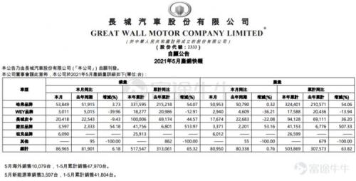 兴业证券研报认为,长城5月销量创5月记录,环比下降预计系新旧产品切换与芯片短缺拖累。5月公司批售8.7万辆,创历史5月销量峰值。5月公司海外销售10079辆,环比+11%,表现良好。