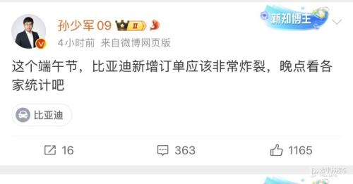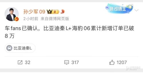 6月11日,汽车达人孙少军发文表示:这个端午节比亚迪新增订单应该非常炸裂,随后又发文透露:比亚迪秦L和海豹06累计新增订单已突破8万辆。这里所说新增8万辆,目前尚未明确是上市以来还是端午节期间订单。