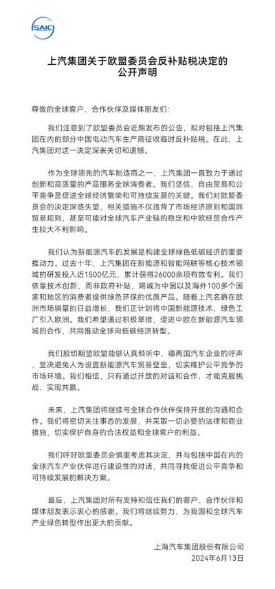 6月13日,上汽集团发布关于欧盟委员会反补贴税决定的公开声明。“上汽集团对这一决定深表关切和遗憾”。“我们坚信,自由贸易和公平竞争是促进全球经济繁荣和可持续发展的关键因素”。“我们对欧盟委员会的决定深感失望,相关措施不仅违背了市场经济原则和国际贸易规则,甚至可能对全球汽车产业链的稳定和中欧经贸合作产生较大不利影响”。具体信息如下: