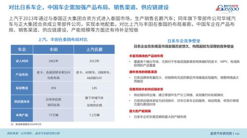 但崔东树同时指出,“在新能源方面,我们现在只是抓住了阶段性机会,获得了增长,在技术品质各方面仍要做好准备。”话说回来,电气化和智能化只是中国车企在东南亚市场的一块敲门砖,并不足以成为中国车企在应对日系车竞争时的决胜宝典。盖世汽车研究院指出,对比日系车企,中国车企在产品布局、销售渠道、供应链建设、产能规模等方面还有待补足短板。跟日系竞争,最终还是要进行全产业链的竞争。