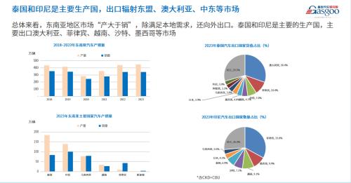 据世界汽车工业协会数据显示,2023年,泰国汽车产量达184万辆,全球排名第10;印尼汽车产量达140万辆,全球排名第15;马来西亚也跻身全球前20,产量为77万辆。销量方面,印尼去年共售出逾100.5万辆新车,马来西亚和泰国的销量在75万辆以上。总体来看,东南亚地区市场“产大于销”,除满足本地需求,还向外出口。泰国和印尼是主要的生产国,主要出口澳大利亚、菲律宾、越南、沙特、墨西哥等市场。