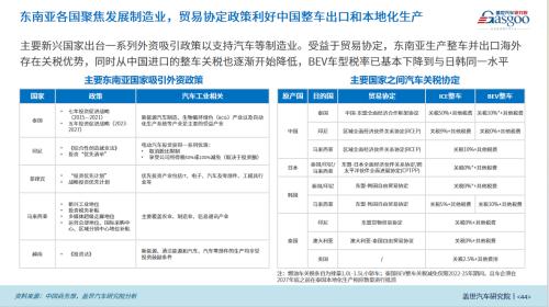 此消彼长,中国车企若出海欧洲受挫,必定会将目光投向其他增长型市场,东南亚便是其一。相较于欧盟对中国电动车出台的针对性举措,东南亚国家的政策则更为友好。泰国、印尼和菲律宾等主要东南亚国家出台了一系列外资吸引政策以支持汽车等制造业;与此同时,从中国进口的整车关税也逐渐开始降低,目前东南亚国家对中国产纯电动车的进口税率已基本下降到与日韩同一水平。此外,受益于贸易协定,在东南亚生产整车并出口到海外存在一定的关税优势。