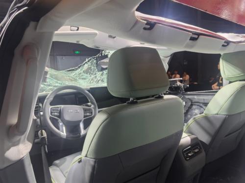 为了直观展现这款车型的安全实力,北汽进行了一系列震撼的测试。在首次公开的挑战中,一把重量高达1吨的巨型大刀由10米高空自由落体下坠,直击全新BJ40刀锋英雄版的车顶。测试结果令人惊叹:车身结构在遭受如此重击后依然保持完整,B柱仅出现轻微弯曲,车顶略有塌陷,但车门依然能够轻松开启,车辆也能正常启动行驶。这充分证明了全新BJ40刀锋英雄版在极端情况下的出色安全性能。