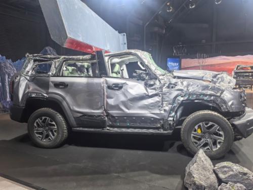 测试结果显示,得益于坚固的大梁保护,车辆底盘前悬挂毫发无损,后桥也几乎没有明显问题。更令人惊叹的是,机舱前的两个前指梁结构保持得完好如初,有效保护了发动机舱免受碰撞。这正是全新BJ40刀锋英雄版作为纯正硬派越野车的独特之处:其车架与车身分离设计,通过悬置连接,展现出极强的抗冲击和抗颠簸能力,同时振动过滤功能也更加出色。