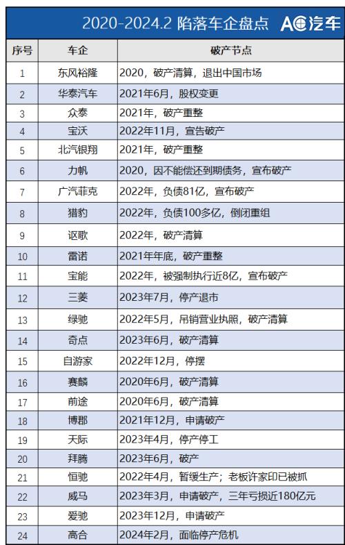 AC汽车统计了自2020年以来,已有24家车企或破产清算,或停工停产,其中传统燃油车企12家,新势力车企