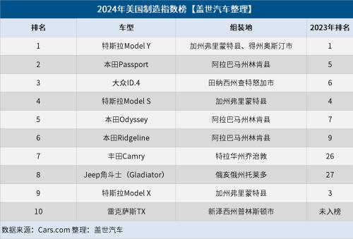 在今年的榜单中,特斯拉Model Y再次排名第一,特斯拉也是唯一一家在美国生产的所有汽车都在美国市场销售的汽车制造商。