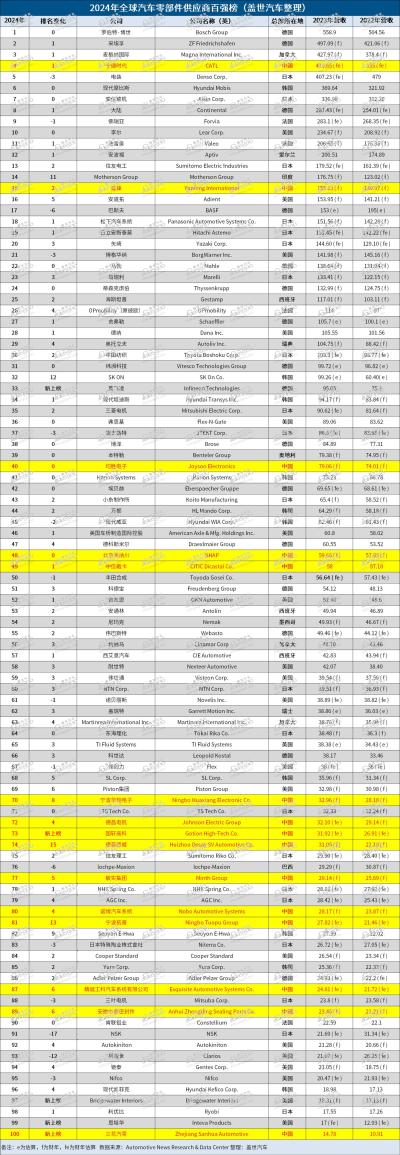 6月23日,《美国汽车新闻》(Automotive News)重磅发布了2024年全球汽车零部件供应商百强榜。值得一提的是,今年上榜的中国企业又多了两家,分别是国轩高科和三花汽零,另外宁德时代的排名又上升了一位,目前仅次于博世、采埃孚和麦格纳国际这三家传统零部件巨头。中国企业一共上榜15家,其中前50名中有5家。