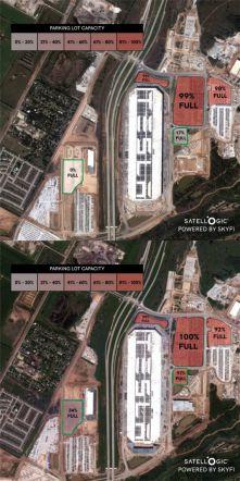 从网传的图片显示,通过对比2023年10月和2024年3月的美国得克萨斯超级工厂卫星图像,可以看出在2023年10月,得克萨斯超级工厂左下角区域的存放状态为0%,右边中间的停车区域是17%,到了2024年3月,这两个区域分别为34%和97%。