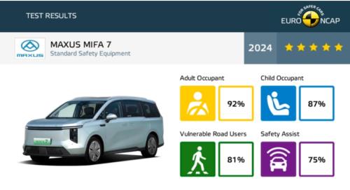 最新一期的全球最高安全评级认证欧洲Euro NCAP(欧盟新车安全评鉴协会)安全碰撞测试成绩公布:上汽大通MAXUS旗下大家7高分斩获五星安全认证,其中在最为重要的工况之一碰撞工况五大测试项目四项均获得满分,成为新版Euro NCAP法规实施后,首款也是唯一一款斩获四项满分的MPV。