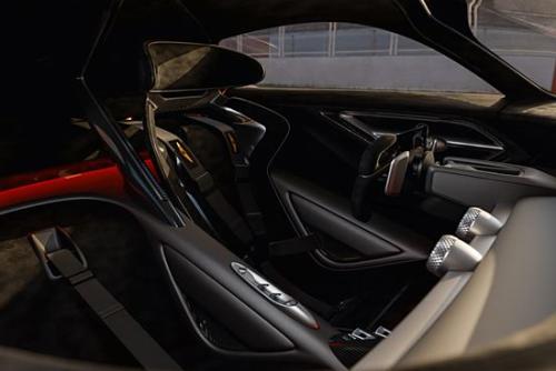 内饰方面,为了极致的轻量化,车内的设计极其简约,并且大量采用了碳纤维材质。车内配备了一体式防滚架,液晶屏可以展示驾驶信息,赛车方向盘上的旋钮则可以快速调整驾驶模式等等。
