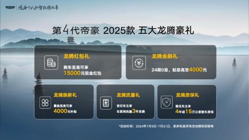 为了更好的满足用户需求,第4代帝豪2025款不仅继承了帝豪家族的颜值、架构、科技和品质四大冠军基因,还在外观、内饰和智能等维度进行了全面焕新升级。新车共推出1.5D-5MT和1.5D-8CVT两种动力组合共4款车型,官方指导价6.99-8.89万元。在7月6日—7月31日期间购买第4代帝豪2025款的用户,还可享受五大龙腾豪礼,包括: