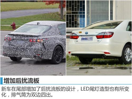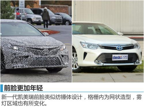 从网上车市获得的谍照来看,新一代丰田凯美瑞在外观设计上将更加年轻化。前脸为与雷克萨斯相近的纺锤体造型,上进气格栅更加粗壮宽阔,下进气格栅面积更小。而且格栅内采用网状设计,雾灯区域也重新设计。新车将采用全新的LED尾灯,并增加了小巧的扰流板设计,排气筒变为双边四出。