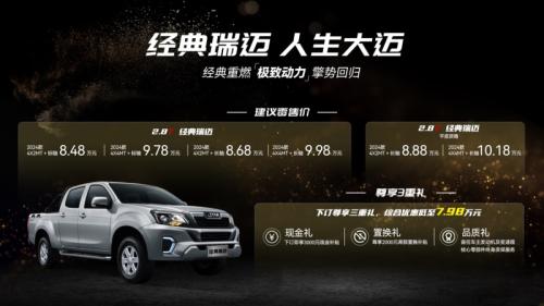 综上,江西五十铃经典瑞迈以澎湃动力、稳定可靠、精工品质、风尚颜值等六大核心价值为驱动力,致力为用户提供扎实可靠的用车体验,以促进千行百业创富业态发展。相信,依托五十铃品牌背书,坚守精工品质,以合资皮卡性价比之王“擎”势回归的经典瑞迈,必将走进千家万户,推动千行百业,赢领创富人生。