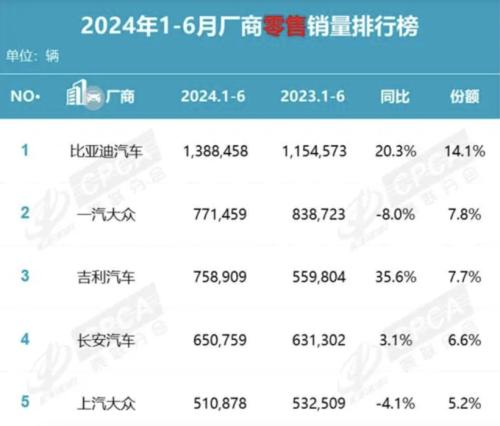 其中,比亚迪半年销量161.3万辆,同比增长28.46%;长安汽车半年销量133.4万辆,同比增长9.7%;奇瑞半年销量110万辆,同比增长48.4%;吉利半年销量95.57万辆,同比增长41%;长城汽车半年销量55.97万辆,同比增长近8%……