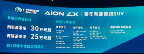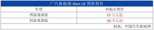 中国汽车新闻网讯8月29日,曾于今年上海国际车展上亮相的广汽新能源AION LX正式开启预售,共推出2款预售车型,补贴后两驱基准版预售25万元起,四驱基准版预售30万元起。新车将于10月份上市,并开始交付。新车定位中型纯电SUV,基于广汽新能源第二代纯电专属GEP平台打造,NEDC工况续航里程可达650km,并配备L3级别自动驾驶功能。