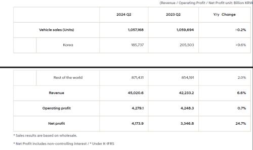 具体看来,今年第二季度,现代汽车的营收同比增长6.6%,达45.02万亿韩元,创新纪录;营业利润增长0.7%,达4.28万亿韩元,同样创新高;营业利润率达到9.5%;净利润增长24.7%,达4.17万亿韩元,是自2022年第二季度创下历史新高以来最高的季度净利润,轻松超过LSEG SmartEstimate汇编的21位分析师平均预期的3.4万亿韩元;同期现代汽车全球销量为1,057,168辆,同比微降0.2%。